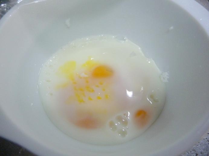 - ラップをして500Wで20秒を3セット温め(必ず時間をわける)、様子を見ながら加熱時間を調整し、卵を細かくほぐす。
