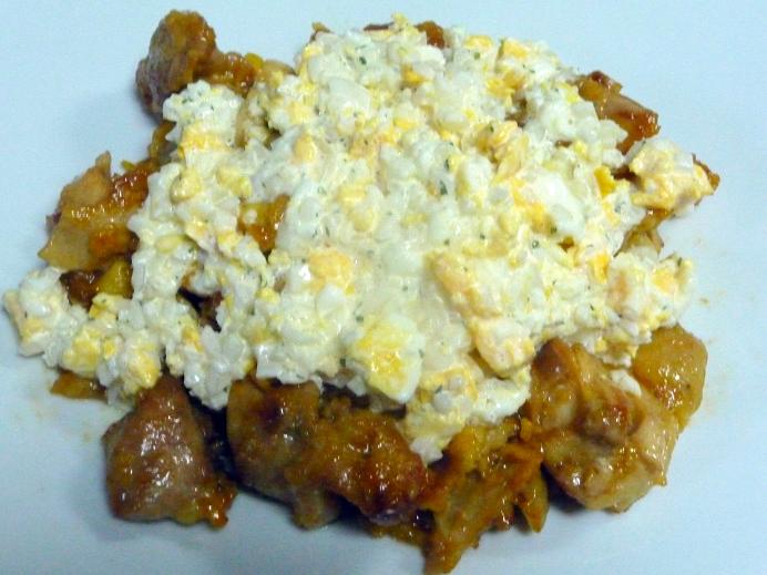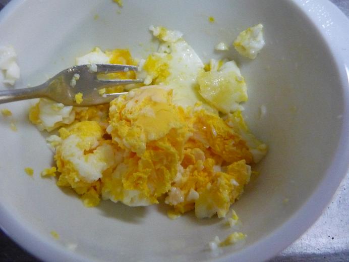 フォーク等で卵を細かくほぐしておきます。