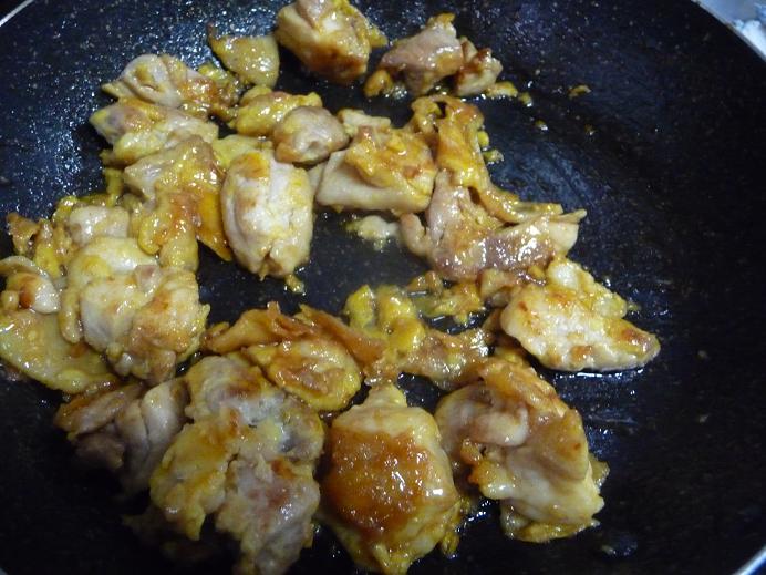 - フライパンに油をひき、鶏肉に火を通したら、一度取り出しておく。