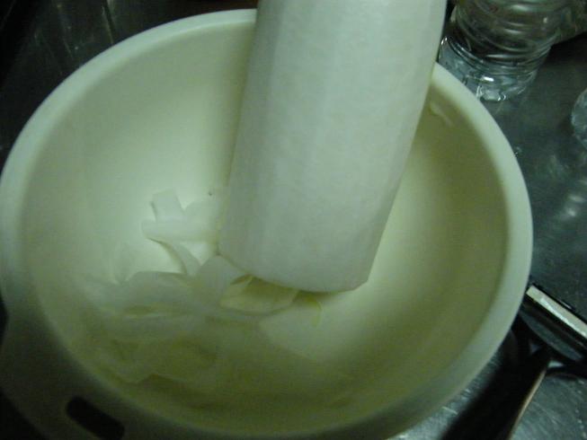 - 大根をピーラーで、きし麺状にスライスする。