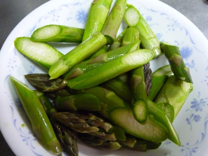 - アスパラは筋を落とし、食べやすい大きさに斜め切りにする。