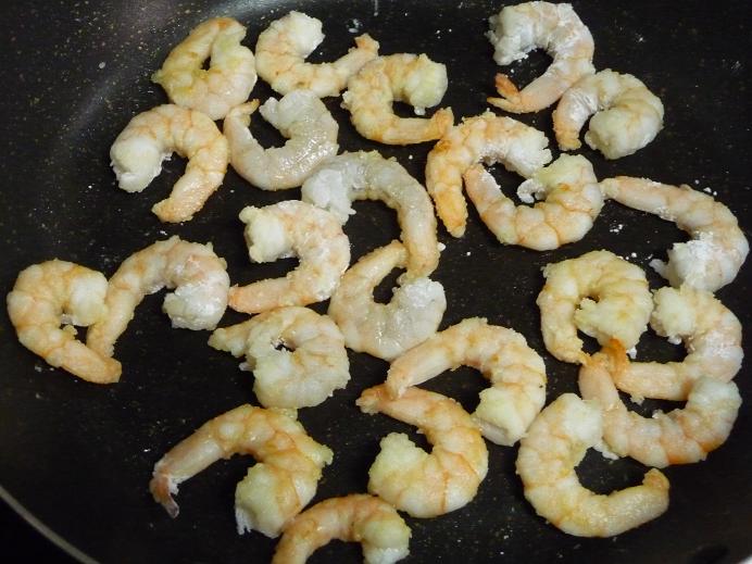フライパンに油をしき、中火でエビを炒めていきます。