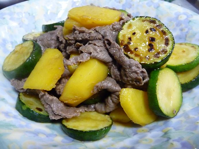 - フライパンに油をひき、中火でズッキーニを炒める。両面に焼き色がついてきたらジャガイモも加えてさらに炒め、軽く塩コショウする。
