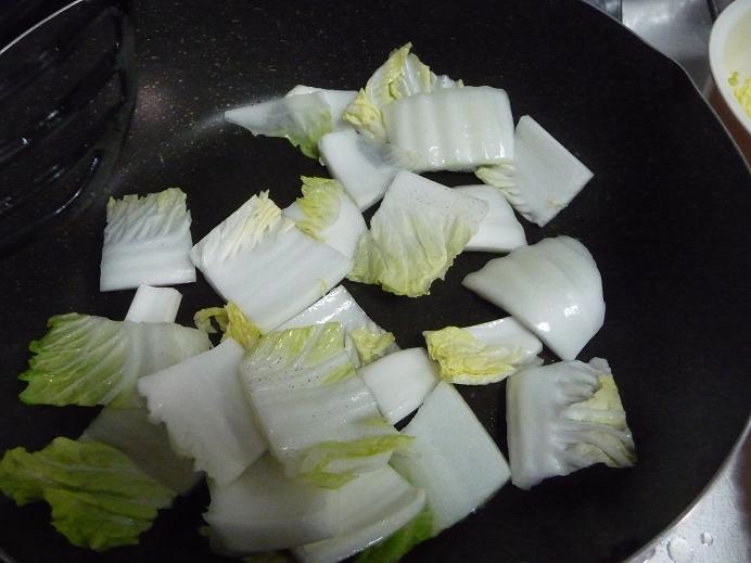 先ほどのフライパンに白菜の白い部分を先に入れ、2分ほど炒めます。(中)