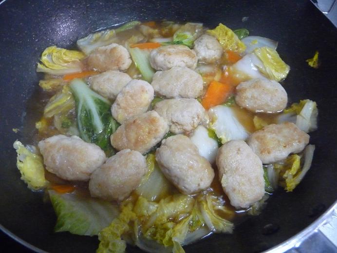 白菜の葉とニンジンも入れさっと炒めたら、調味料とつくねを入れます。