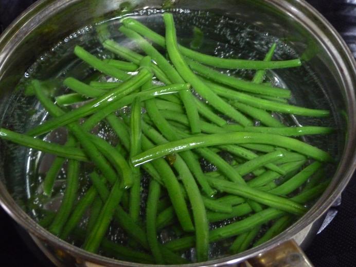 1. いんげんは角を落とし、沸騰したお湯で3分茹でる。