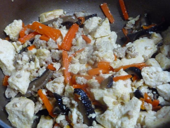 2分ほど炒めたら、しいたけも加え炒め、調味料□を入れ下味をつける。 - さらに豆腐を加えて鍋の中で好みの大きさにほぐし、調味料★を入れて中火で4分炒める。
