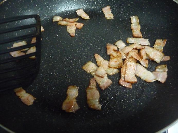 ベーコンは1センチ幅に切っておく。 - フライパンにベーコンを入れ、カリカリになって油がでてきたら一度取り出しておく。