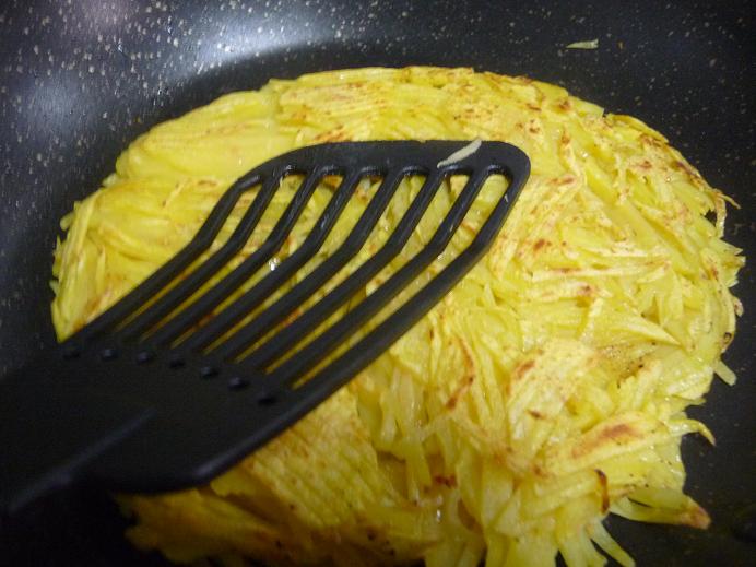 - 必要であれば小量の油を足し、先ほどのフライパンにジャガイモを広げて片面3分ずつ焼く(中火)。