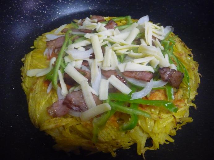 - ケチャップを薄く塗り広げ、ピーマン、玉ねぎ、ベーコン、好みの量のピザチーズを乗せ、蓋をして弱火で8分蒸らします。