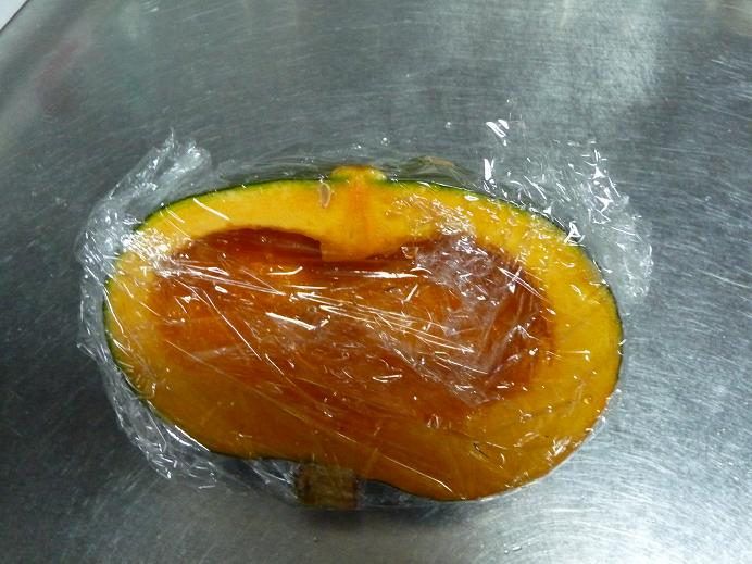 - かぼちゃは種を取り、ラップをして600W2分ほど温め、2分冷ます。