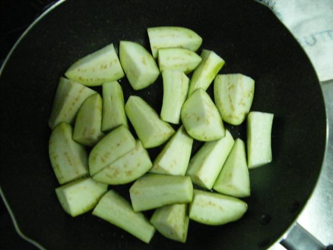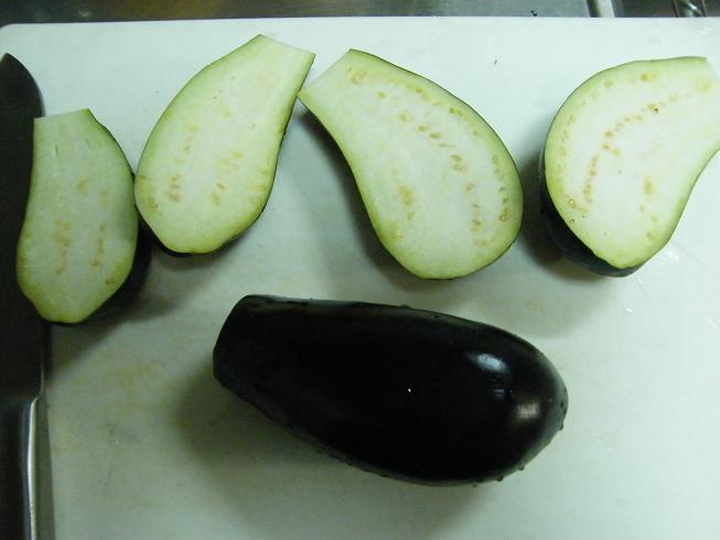 - なすはヘタを落とし縦半分にし、切り込みを入れ、さらに4等分にする。