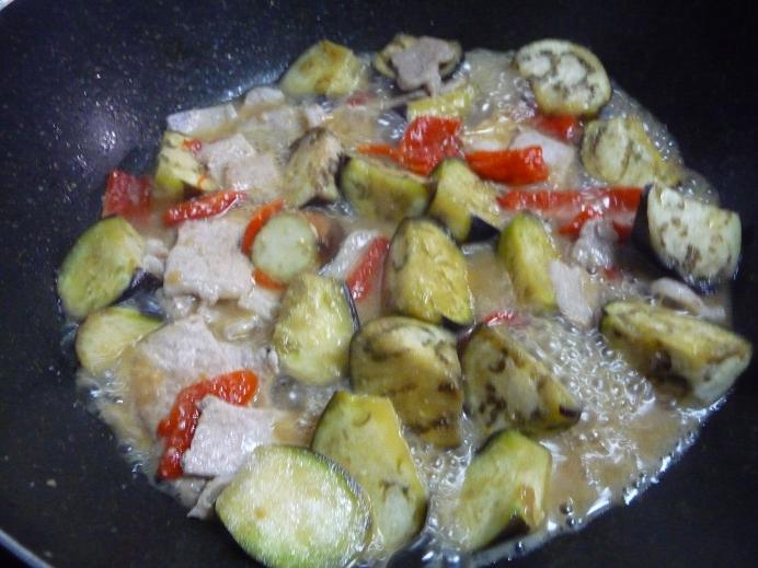 豚肉に火が通ってきたら、パプリカと加熱したナスを加え、中火で炒めます。