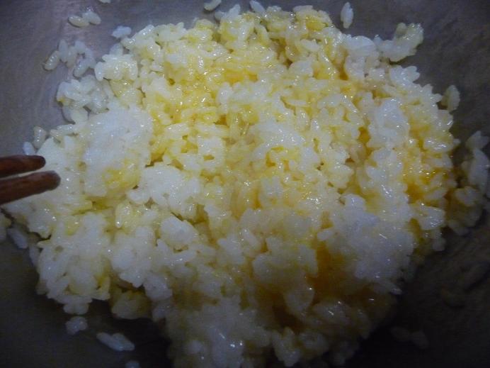 沢山かき混ぜるとご飯粒がつぶれてしまうので、少し我慢です。