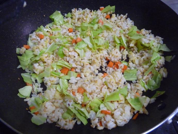 そうすると卵が固まる上、米粒同士をゴマがくっつかないようにしてくれて、パラパラした見た目になります。
