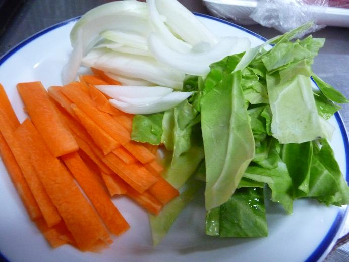 - にんじんは薄い棒状、キャベツは1,5センチ幅の食べやすい大きさに切る。