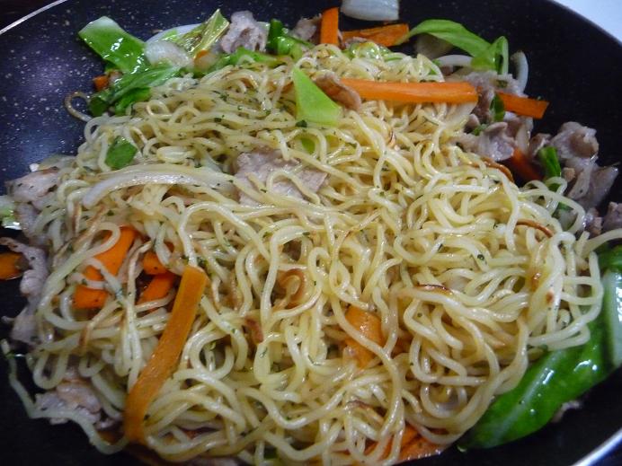 3、材料を炒めて麺を加える