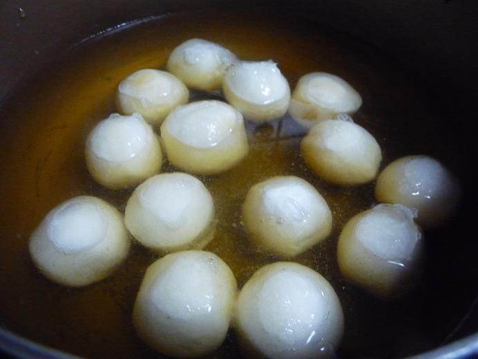 竹串が通るくらいに柔らかくなったら、さといもをボウルにうつします。