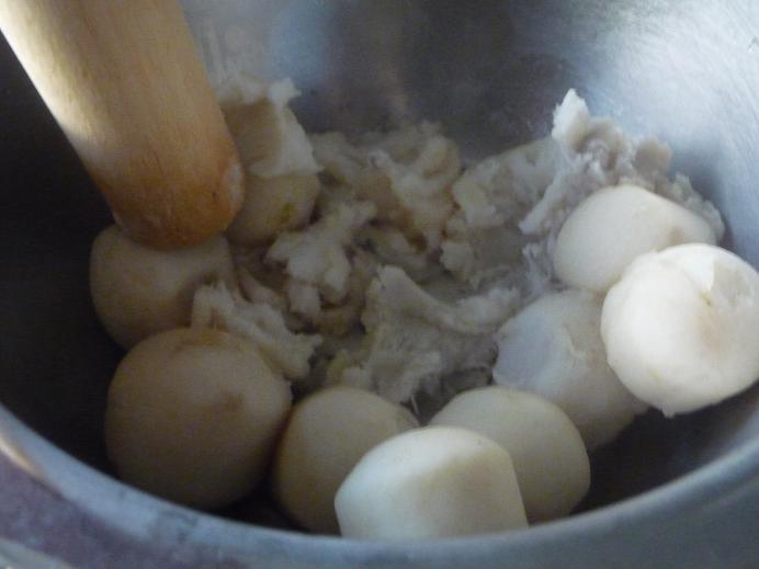 竹串が通るくらいにやわらかくなったら、里芋をボウルにうつし、すりつぶします - 粗熱を取ったら食べやすい大きさに等分しておきます。