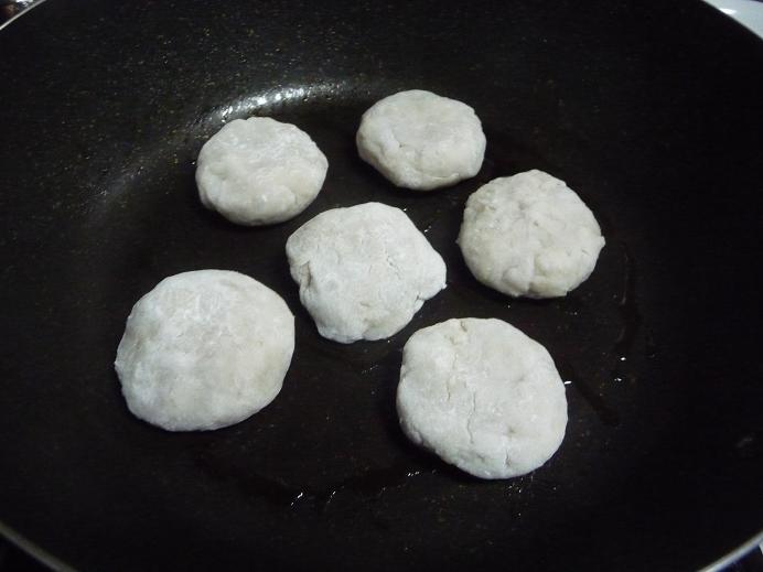 フライパンに油をひき、さといももちを並べて中火で焼きます。