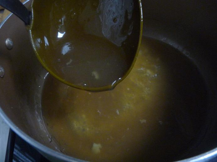 先ほどの煮汁を再び沸騰させたら一度火を止めます。