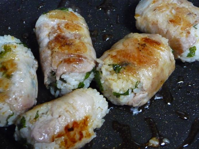 ラップを取ったご飯に豚肉を巻き、もう一度ラップをし、きつく握っておく。 - フライパンに油を敷き、肉まきを入れて弱火で転がしながら炒めていく。