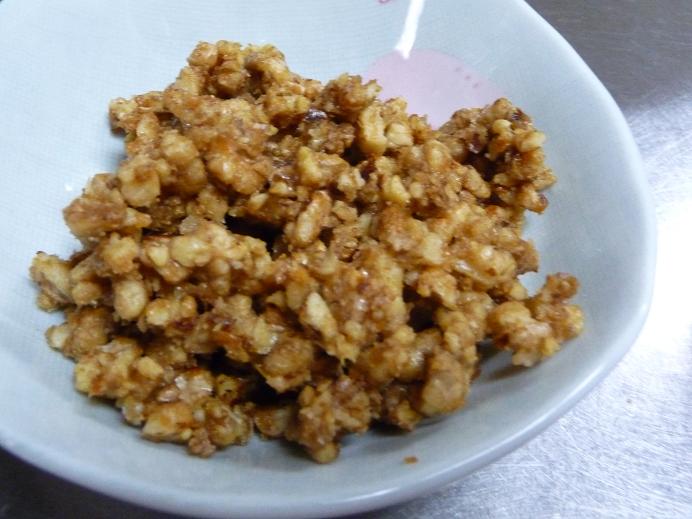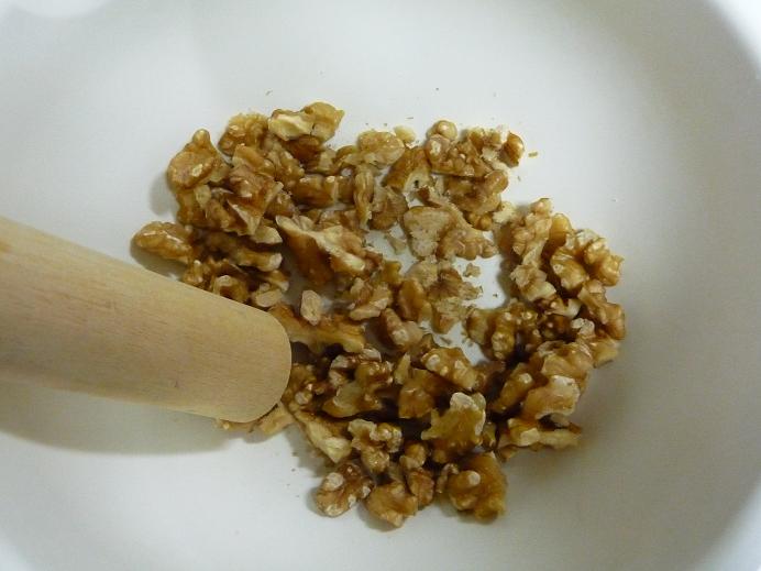 クルミは手で粗く崩し、棒などで潰して好みの大きさにしておきます。