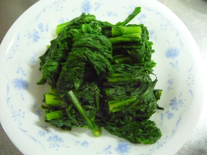 - 鍋に塩小1をいれた水を沸かし、根の部分だけで30秒、葉の部分をいれて15秒したらすぐに取り出す。