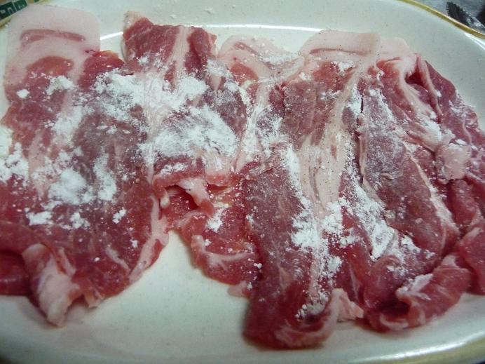 - 豚肉は両面に塩コショウし、小麦粉を薄くつけておく。