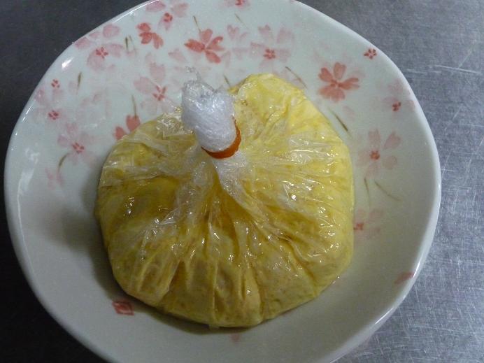 - ラップをねじって輪ゴムで止め、中身が出ないようにし、中火で15分茹でる。