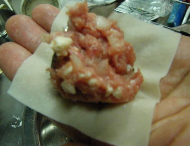 - 豆腐は水切りする。玉ねぎはみじん切り、しいたけは粗いみじん切りにしておく。