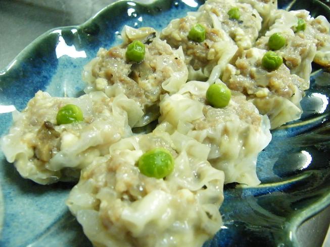さらにシイタケ、水切り豆腐、豚ひき肉、調味料★を入れ、軽く練り合わせる。 - シュウマイの皮にあんを包み、グリンピースを中央に乗せる。